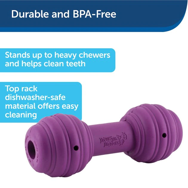 Shake the Chuckle for an engaging “chuckle” sound. Randomly dispenses kibble or treats. Patented Treat Meter can be adjusted to make treats come out faster. It’s soft rubber inner-facing prongs move aside for easy stuffing of kibble or dry treats. It redirects potentially destructive chewing behavior and is ideal for all types of chewers. This dog toy is perfect for hours of positive playtime.