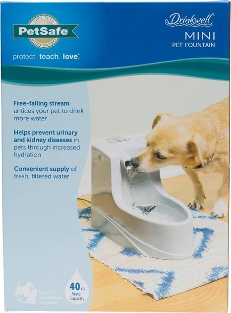 The Drinkwell Mini is the perfect fountain for small or medium dogs and cats. The Mini Fountain spouts 40 ounces of fresh, filtered water, giving your pet the option to drink from the flowing stream of water or the shallow bowl. Your pet’s drinking water is filtered through the activated carbon filter, keeping water clean and fresh-tasting. The free-falling stream of water adds oxygen, which keeps water naturally cool and encourages pets to drink more. The narrow, compact design is easy to fit in any room in your room, and the fountain comes apart for easy cleaning.