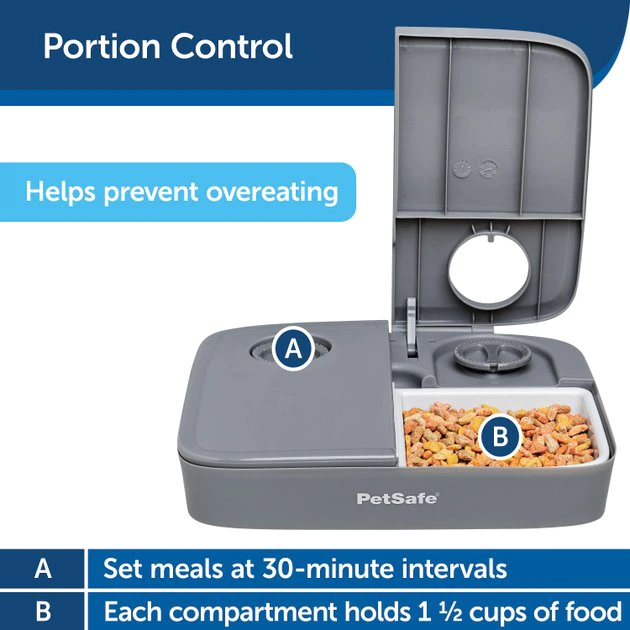 - Each compartment holds up to one and a half cups of your furbaby’s favorite dry or semi-moist food to help keep portions under control.