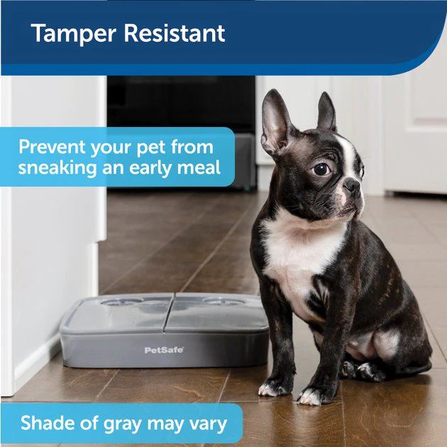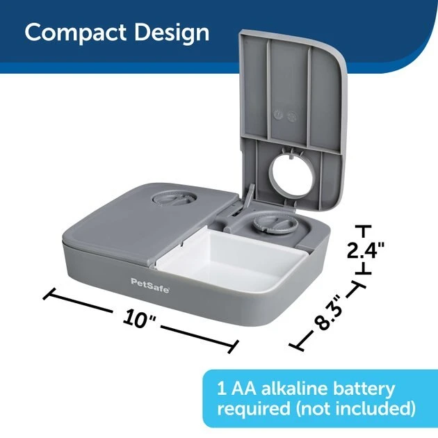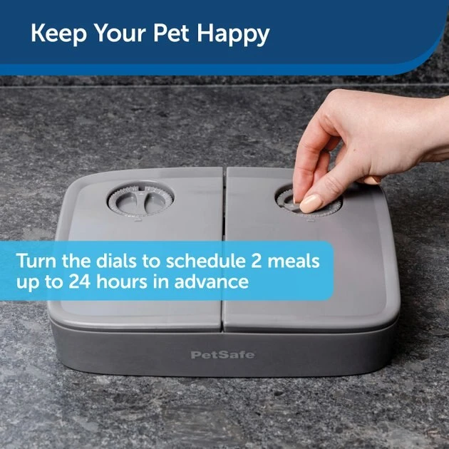 Your pet will never miss a meal with the PetSafe Automatic Two-Meal Dog Feeder! This automatic feeder helps you maintain a consistent feeding schedule for your pet whether you’re at home or away. The easy dial timer lets you schedule two meals up to 24 hours in advance. Simply add your furbaby’s favorite dry or semi-moist food to each compartment. The tamper-resistant lids will help keep prying paws from getting inside between feedings. Plus, the dishwasher-safe removable tray makes cleanups a breeze.