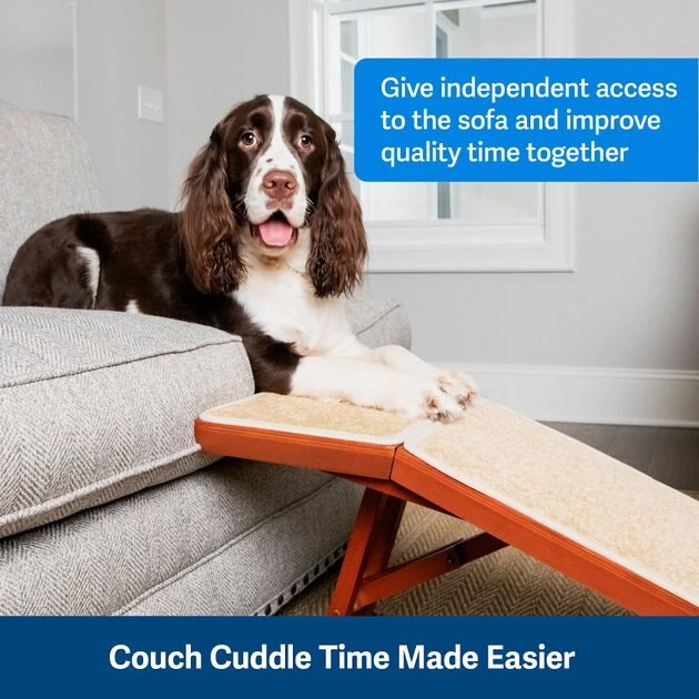 Help your couch potato get to her comfy spot with the PetSafe Cozy Up Sofa Ramp. This sturdy wooden ramp helps furry companions up to 100 pounds get on and off the sofa without having to jump. The carpet covers on the steps provide traction for your pal’s paws—helping her walk up and down the steps without slipping. The ramp features a stylish cherry finish and can be easily folded flat and stored when not in use. It’s a great way to protect your precious pal’s joints and make it easier for her to curl up on her favorite piece of furniture!