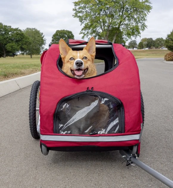 Bring your bestie on your next bike ride with the PetSafe Happy Ride Steel Cat & Dog Bicycle Trailer. This lightweight bike trailer for pets allows your furry friend to tag along with you just about anywhere. It’s designed for durability and long-lasting use with a strong aluminum frame and a trailer hitch that quickly connects to your bicycle. Your pet pal will enjoy a comfy ride with a full view of the road through the front and back windows and optimal airflow with the ventilated sides. Three storage pouches on the outside make sure you guys will have everything you need and when you’re all done, this convenient pet bicycle trailer collapses for easy storage.