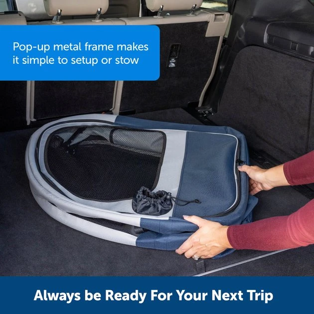 Your best bud will be psyched to travel in PetSafe’s Happy Ride Collapsible Cat & Dog Travel Crate! This roomy, portable, aluminum frame crate is designed to feel spacious without taking up the entire backseat—it only fills one spot—so you’ll have room for another passenger. The large, mesh front and sides let your paw-tner see everyone inside the car and allow air to flow, keeping her temperature just right. Plus it gives her the option to look out the car window and lets you peek in to check on her. No need to worry about travel accidents—the cozy pad inside the crate has a removable, waterproof, machine washable fleece cover and the crate’s collapsible outer shell is also machine washable. The crate is designed with slits for seatbelts so it stays securely in place once you install it. Its two doors fully unzip, letting you get your pet into and out of the car with ease. Plus, it has two drawstring openings for easy access even when the doors are zipped. The two storage pockets are great spaces to keep your BFF’s things and the whole crate folds down easily for convenient storage when not in use.