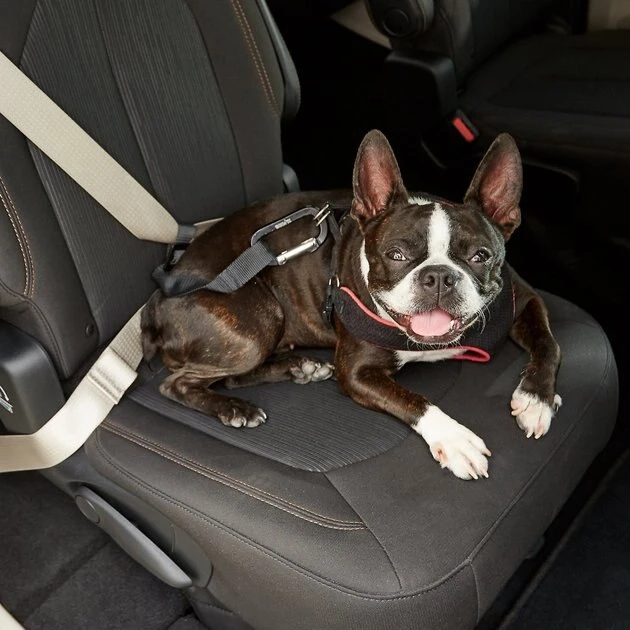 - Simple to install—just slip the seatbelt through the tether loop and connect the carabiner clip to your pooch’s harness to keep him in place.
