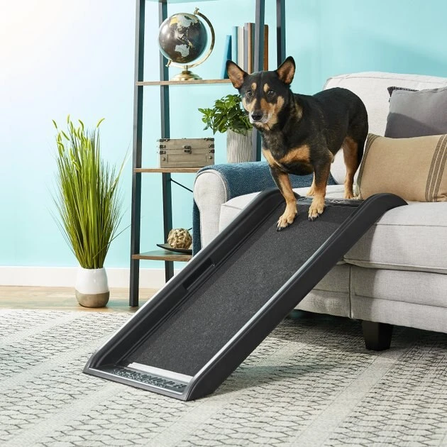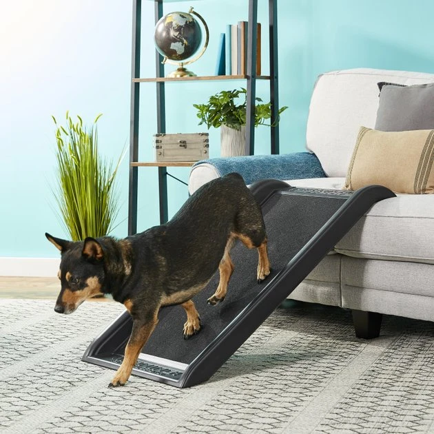 Help your furry friend access higher ground with the PetSafe Happy Ride Dog Ramp. This portable, telescoping ramp is paw-fect for helping your pup climb up on the couch or inside your car, minivan or SUV! It has a convenient portable telescoping design that extends anywhere from 42-70-inches long, allowing your pet to climb to a variety of different heights. It’s crafted from a lightweight fiberglass material that weighs just 16 pounds and is tested to support up to 300 pounds! Whether your dog is small, medium or large, injured, aging or just needs assistance getting up and down, this ramp is a great addition to your household! And to help ensure your paw-tner stays safe and stable, it has a high-traction surface and rubberized feet.