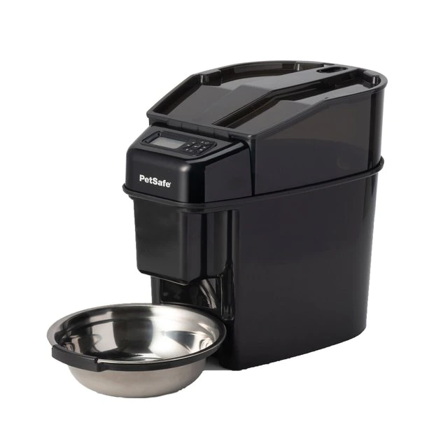 Say goodbye to the early morning wake up “meow” or nose boop. The Healthy Pet Simply Feed will serve your pet breakfast so you can get more shuteye. The feeder portions your pet’s meals to help you manage their weight and keep them healthy and happy. If you have a pet who eats too quickly, the feeder can dispense meals larger than 1/8 cup a little at a time over 15 minutes with its unique slow feed feature. You can schedule up to 12 meals per day from 1/8 – 4 cup portions. This feeder holds 24 cups of dry or semi-moist food and dispenses it using our uniquely designed conveyor system. The pet-proof dispenser is designed to keep pets from sneaking food out of the feeder, and all food contact parts are washable. To clean, place the stainless steel bowl, bowl holder, lid and hopper in your dishwasher and hand wash the conveyor system. Your pet deserves the best. Trust PetSafe to keep your pet healthy, safe and happy.