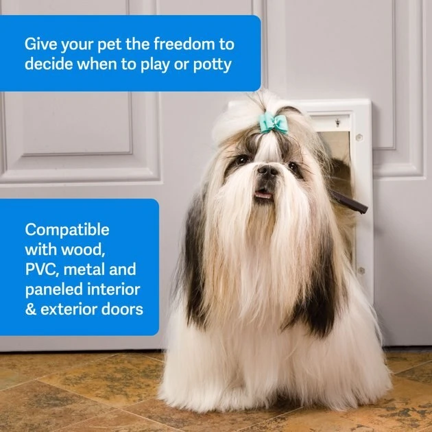 Your paw-some pet knows when he needs to go out. Leave him in charge of scheduling his potty breaks and playtime with PetSafe Pet Door for Dogs and Cats, Easy Installation. You can install it in interior or exterior wood, PVC, metal and paneled doors with a simple DIY project. The white pet door frame is paintable, so you can customize the color to match your home décor. A snap-on closing panel is included—giving you the freedom to lock up the door when you want to control your pet’s access—and keep outside animals from entering your home. This durable, plastic pet door comes in four sizes – just choose the one that best fits your BFF.