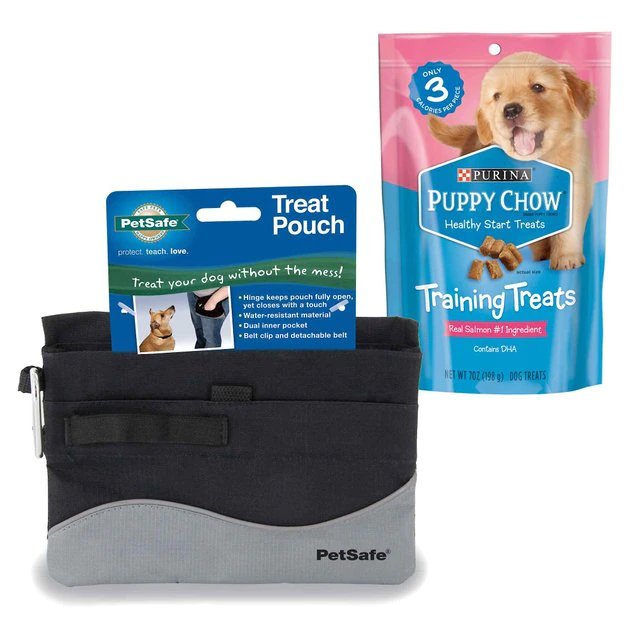 - Comes with the Black PetSafe Mini Treat Pouch and a 7-ounce pouch of Puppy Chow Healthy Start Salmon Flavor Training Dog Treats.
