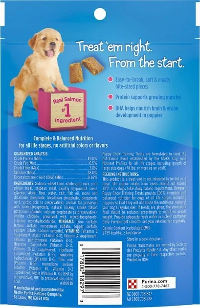 - Treats are crafted with real salmon as the #1 ingredient to help support your puppy’s growing muscles.