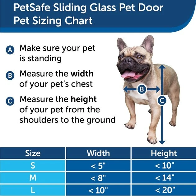 | Pet Door Size | Pet Weight | Flap Opening | Depth | Frame Width | Rise | Shoulder Height |