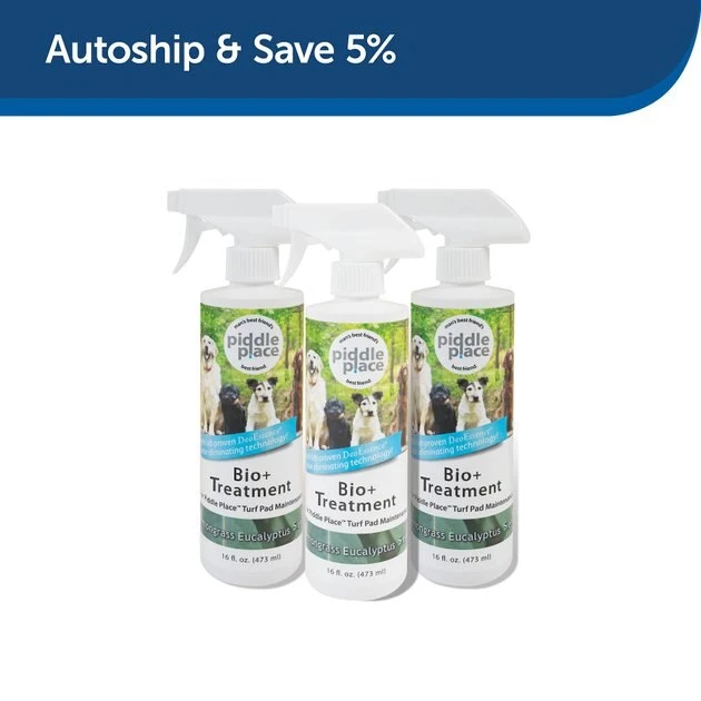 Spritz away your housebreaking woes with the Piddle Place Bio+ Treatment Turf Pad Maintenance. For use with the Piddle Pad indoor toilet, it features the lab-proven DeoEssence Technology, which eliminates pet odors and replaces them with long-lasting freshness. The bio-enzymatic formula actually breaks down the pet waste safely to permanently remove it, rather than just covering it up. All you’ll smell is the delightful lemongrass eucalyptus scent—which also works as a natural attractant to encourage your dog to use the toilet. The all-natural formula is free from chemicals and alcohol so it’s totally safe for you and your pets.