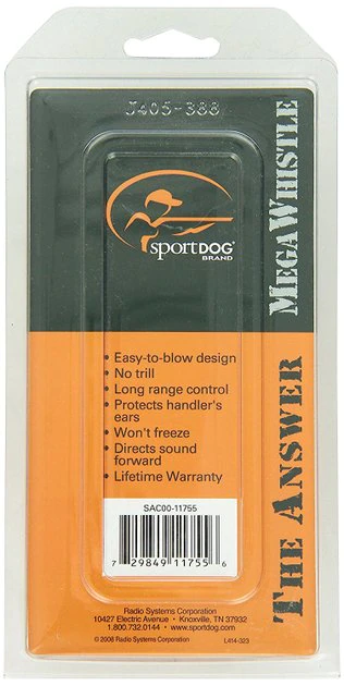 SportDOG Answer Whistle uses the Clear Competition Whistle without a pea for a high, shrill, penetrating tone for the most demanding conditions. The Answer Whistle protects the handler’s ears by directing the whistle’s sound forward.